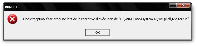 --------------------------- RUNDLL --------------------------- Une exception s'est produite lors de la tentative d'exécution de "C:\WINDOWS\system32\NvCpl.dll,NvStartup" --------------------------- OK ---------------------------