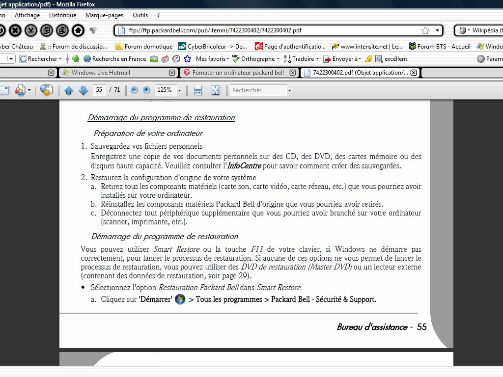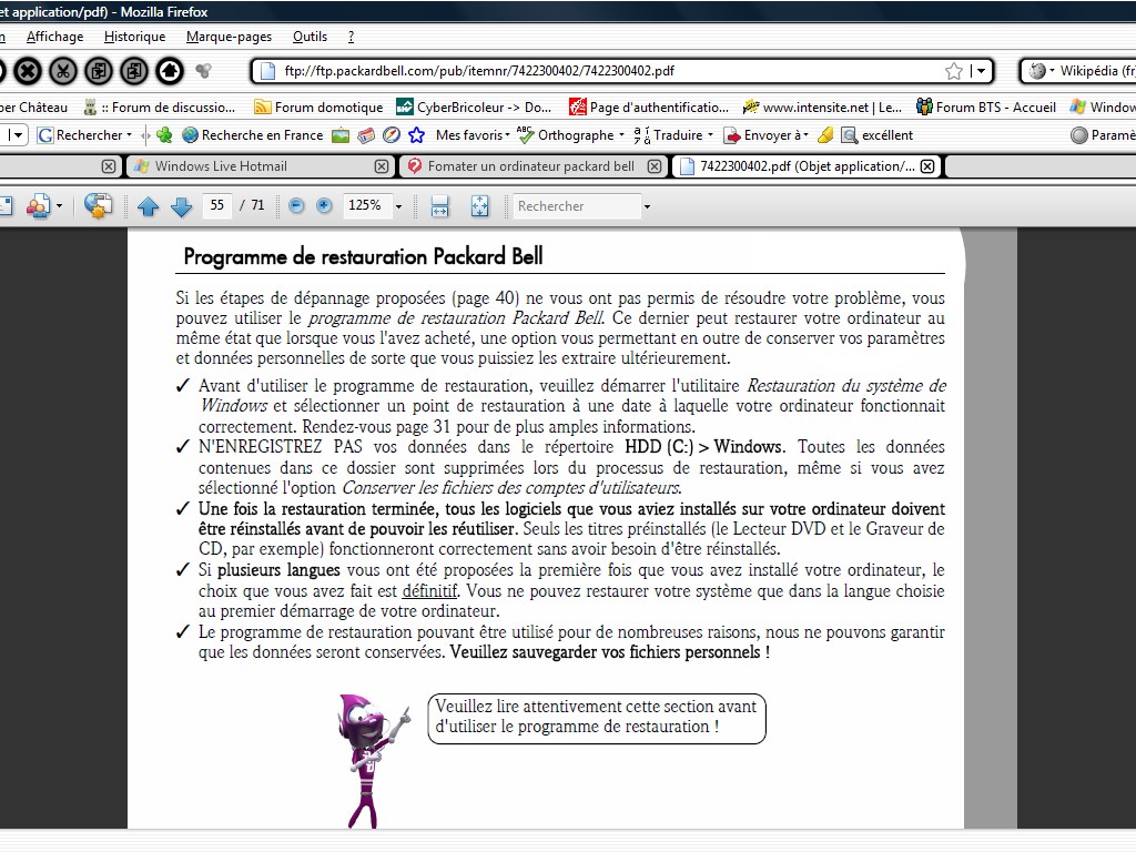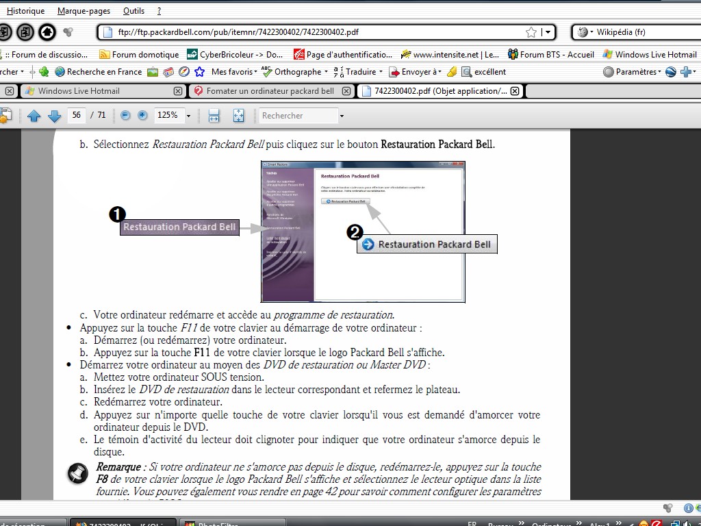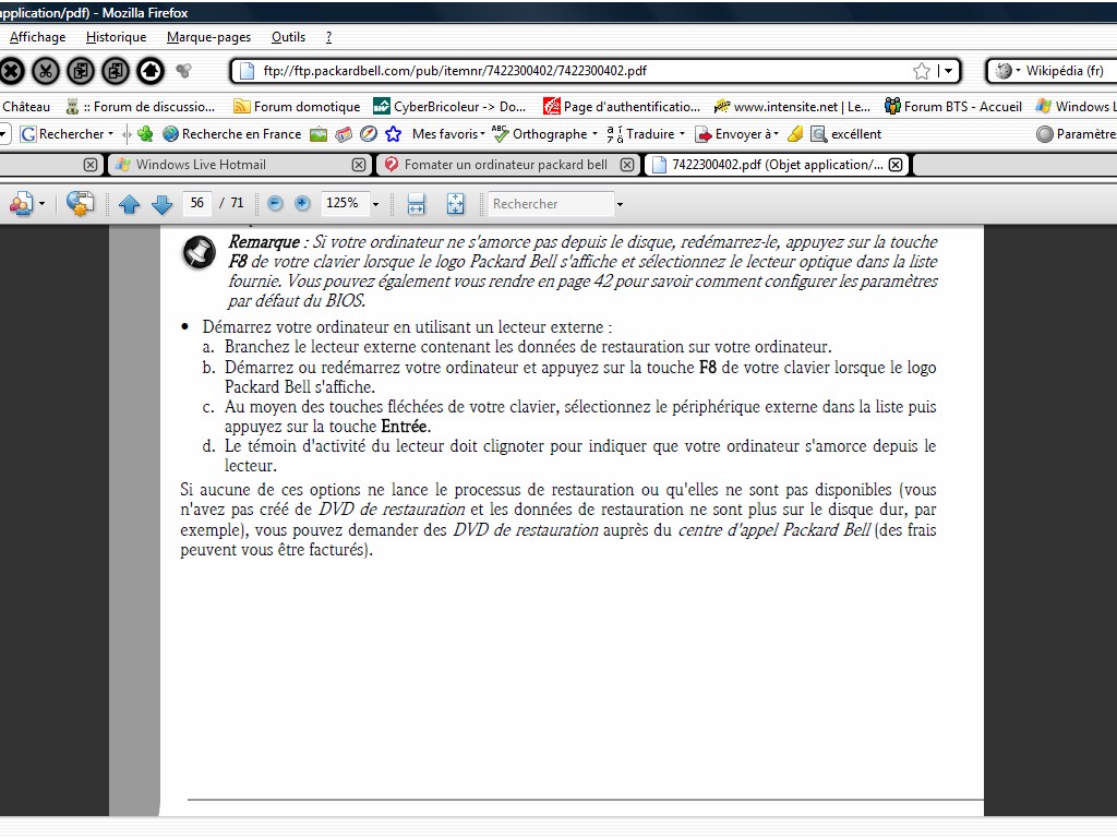 j'ai lu plusieurs topics la-dessus mais je n'ai toujours pas trouvé comment faire pour formater mon PC (packard bell EasyNote MX36). J'ai vu qu'il fallait créer un CD de restauration avec SmartRestore mais impossible de le trouver ! J'ai aussi vu qu'on pouvais le faire sans CD avec "F11" ou "del" mais aucune de ces 2 touches ne fonctionne...