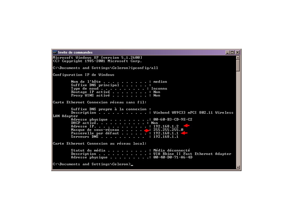 sur le pc, clic sur démarrer, puis exécuter, tapez cmd, une fenêtre va s'ouvrir, tapez IPCONFIG / All