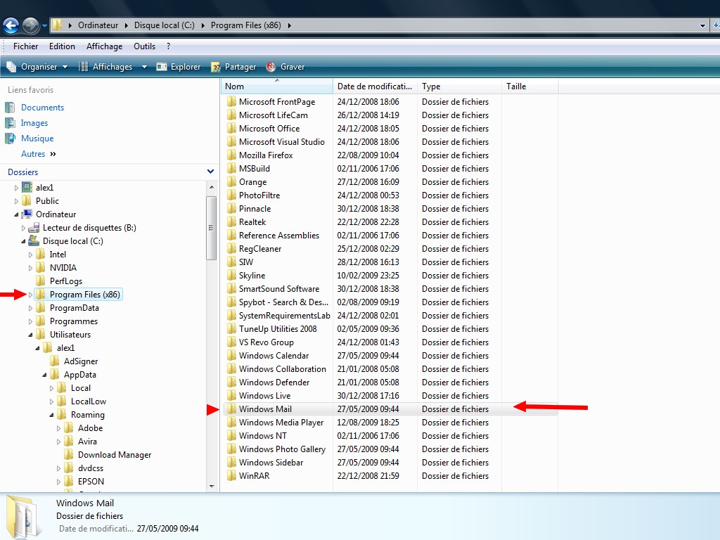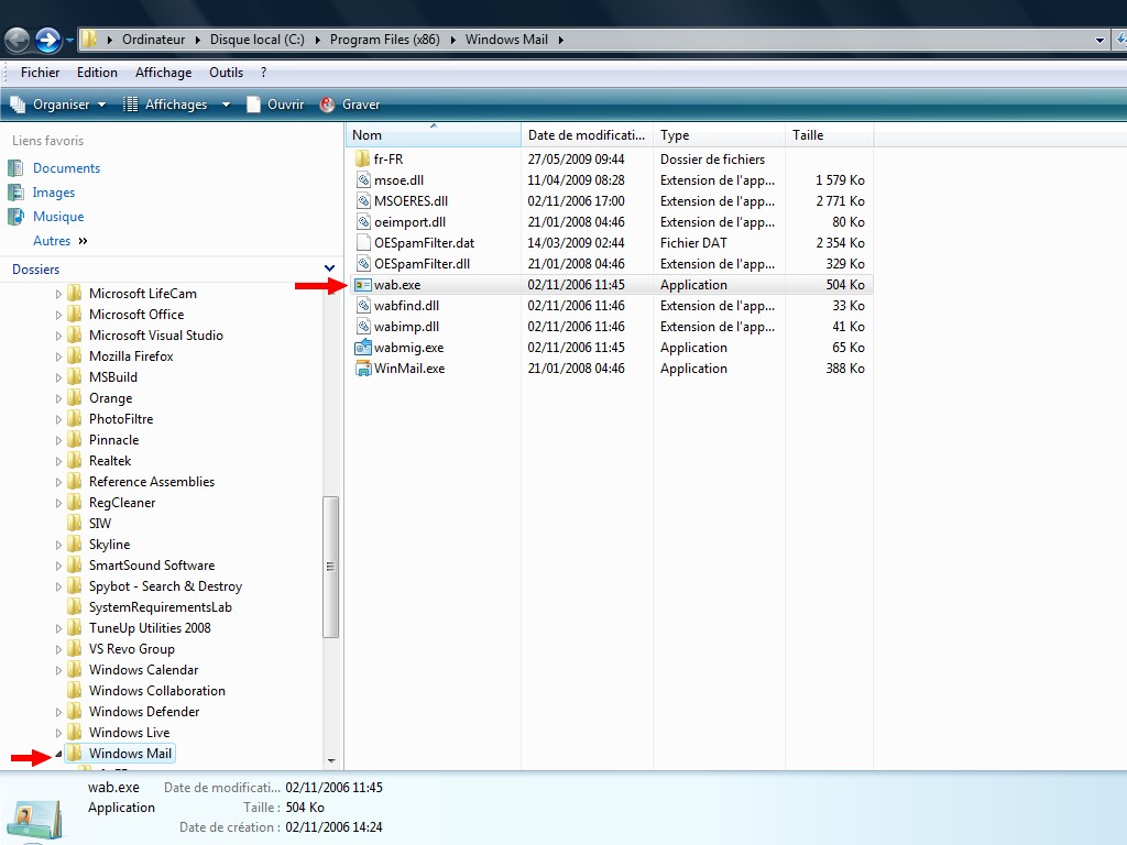 clic droit sur l'icône démarrer, puis clic sur explorer, recherchez le dossier programmes files, voir photo, clic dessus, et ouvrir windowsmail, voir photo 2, et le remettre dans ce dossier.