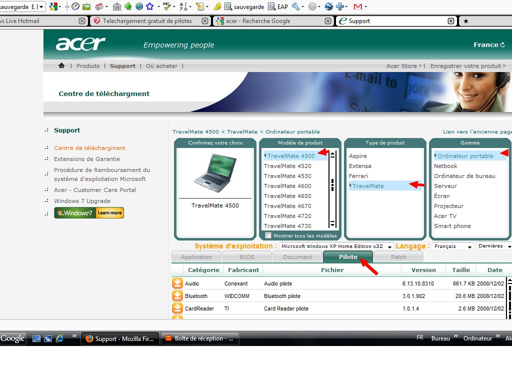 Tu choisis Notebook -> Travelmate -> Travelmate 4500 -> et là, système d'exploitation et langue.