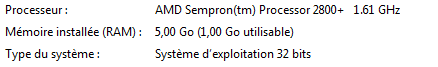 Je suis sous Windows 7 et j'ai un "problème" avec ma mémoire vive. Je vous explique. Il me dit que j'ai 5 Go de mémoire vive et quand je vais dans les propriétés de l'ordinateur, il me met qu'il y a seulement 1 Go d'utilisable. Pourquoi et comment disposer des 5 Go indiqués ?