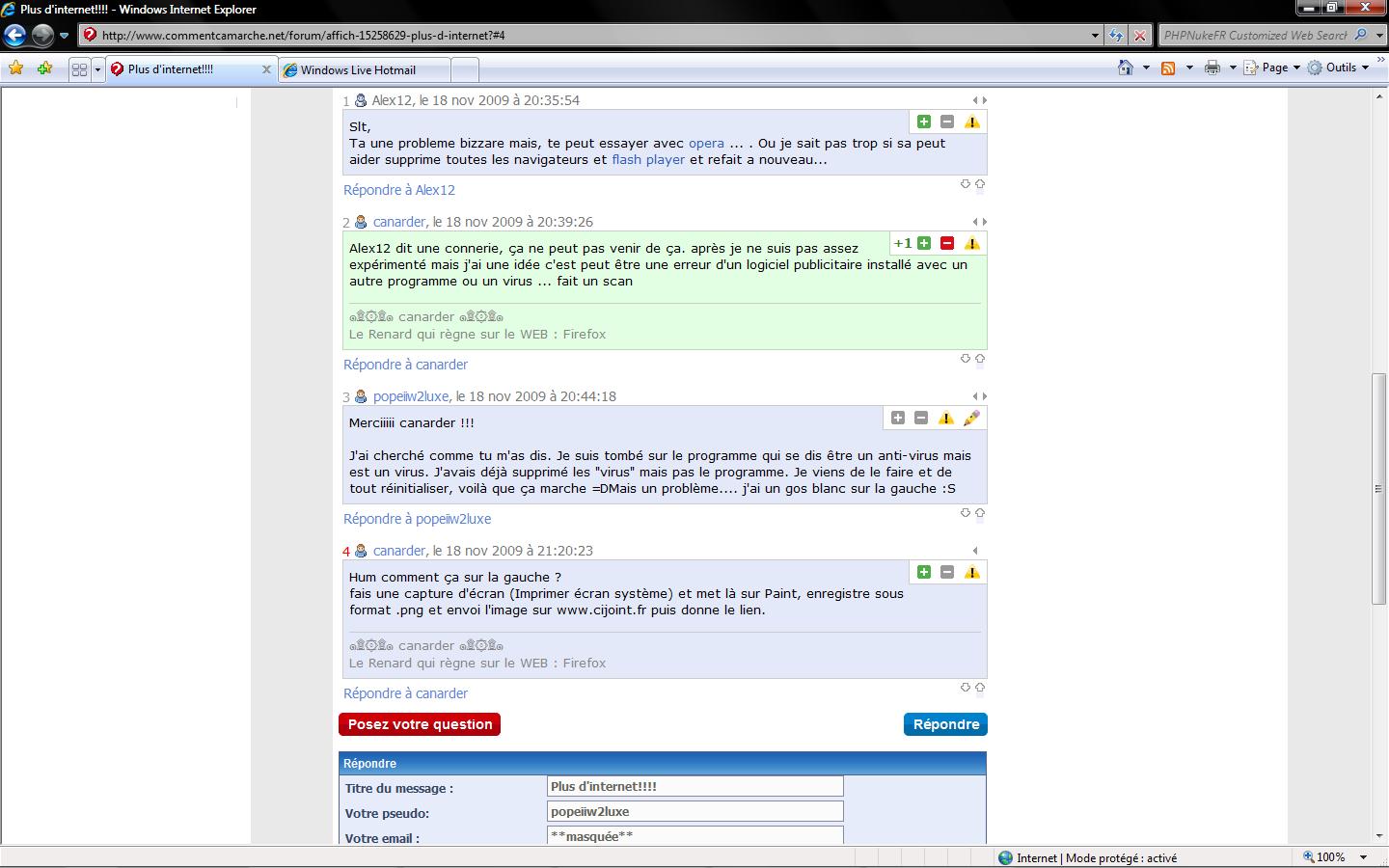 J'ai un énorme problème! Je peux plus aller sur internet. Bon en faîte, avec internet explorer 7, j'avais un message qui apparaissait toujours, en anglais et puis internet se fermait. Heureusement, j'avais firefox mais ce dernier ne marche plus non plus. Enfin, il marche mais dès que je clique sur un liens ou fait une recherche cela apparaît " /!\ 111 " Le nom c'est application java script. Alors j'ai été voir dans les mise à jours à faire sur mon ordi et j'ai téléchargé explorer 8. Mais maintenant, il se ferme aussi vite qu'il est apparut. et je peux vous dire, c'est fatiguant de devoir tout le temps cliqué sur OK pour aller sur une page. Si vous auriez une idée....
