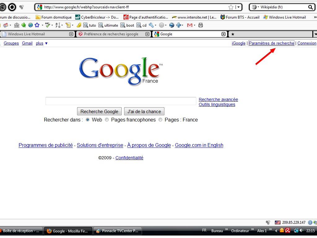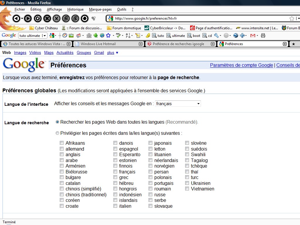 Après avoir effacé tout l'historique , je n'arrive plus à remettre mes préférences de recherches :" en français " sur la page d'acceuil igoogle ; J'ai pourtant autorisé les cookies , mais google se remet toujours sur "web" ; Mon navigateur est firefox 3.5.5 .