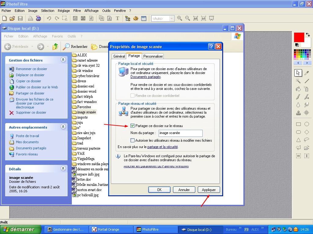 Au moment de la création du réseau local, j'ai activé sur les deux le partabe de fichiers et d'imprimantes.