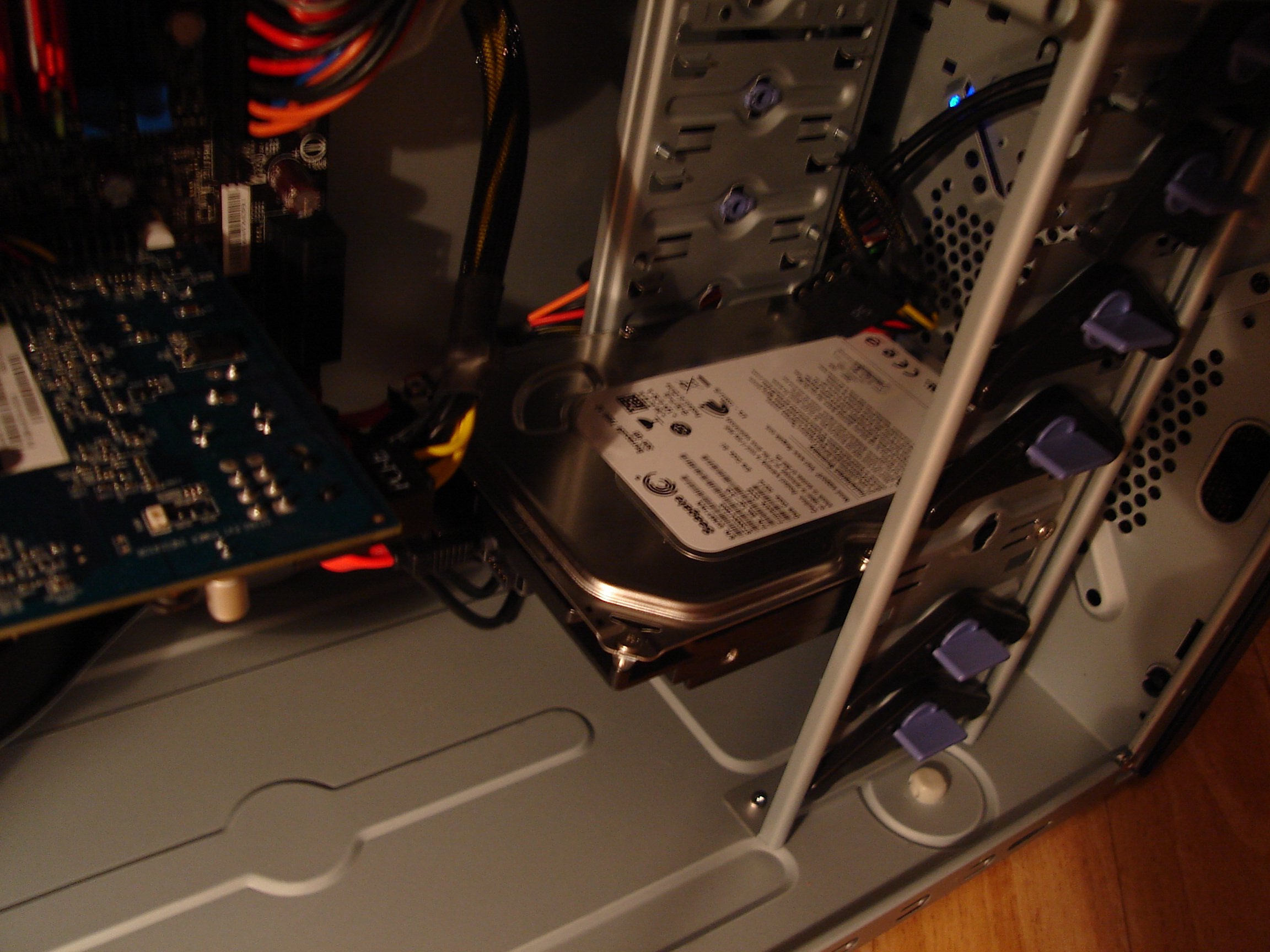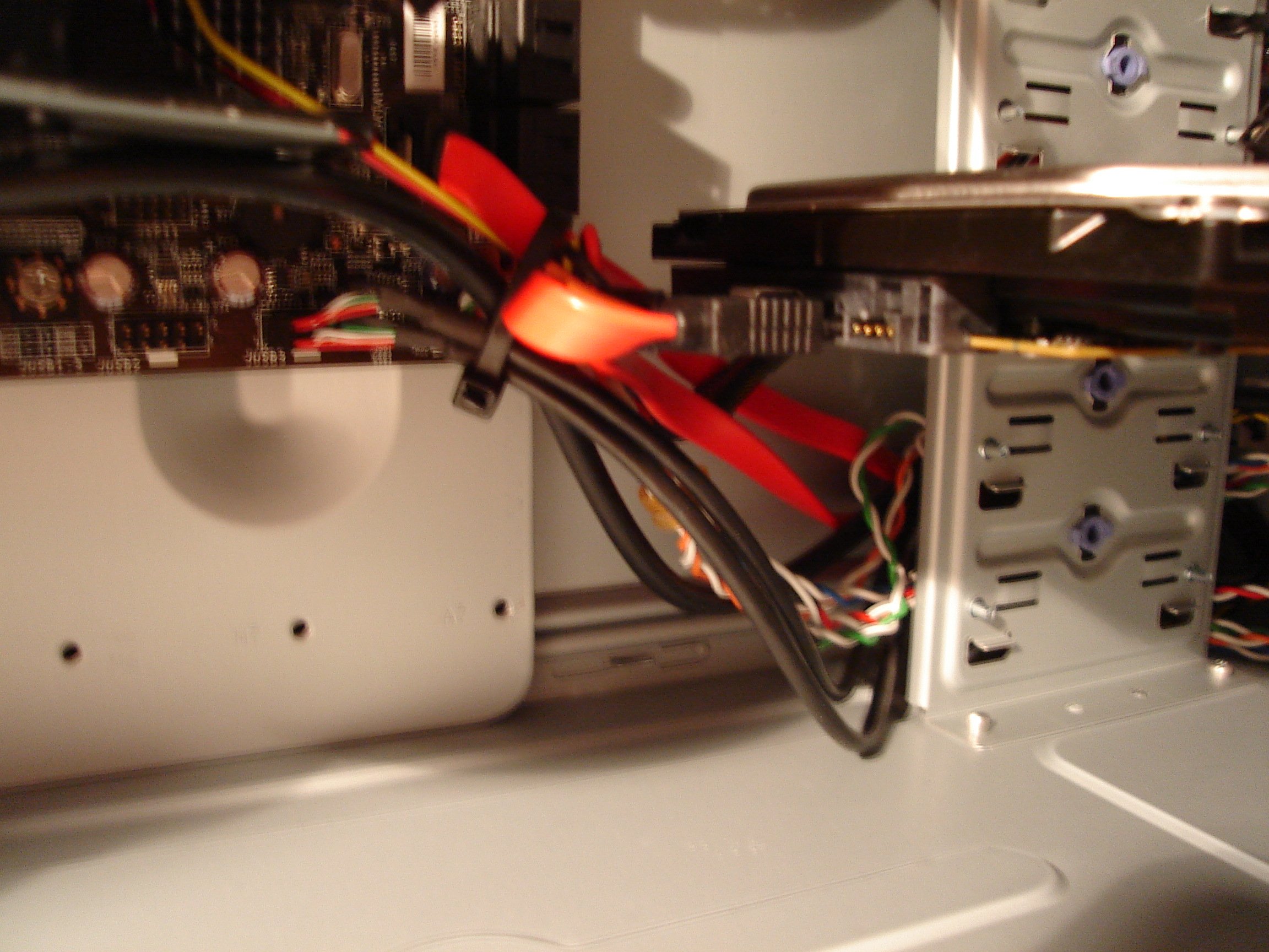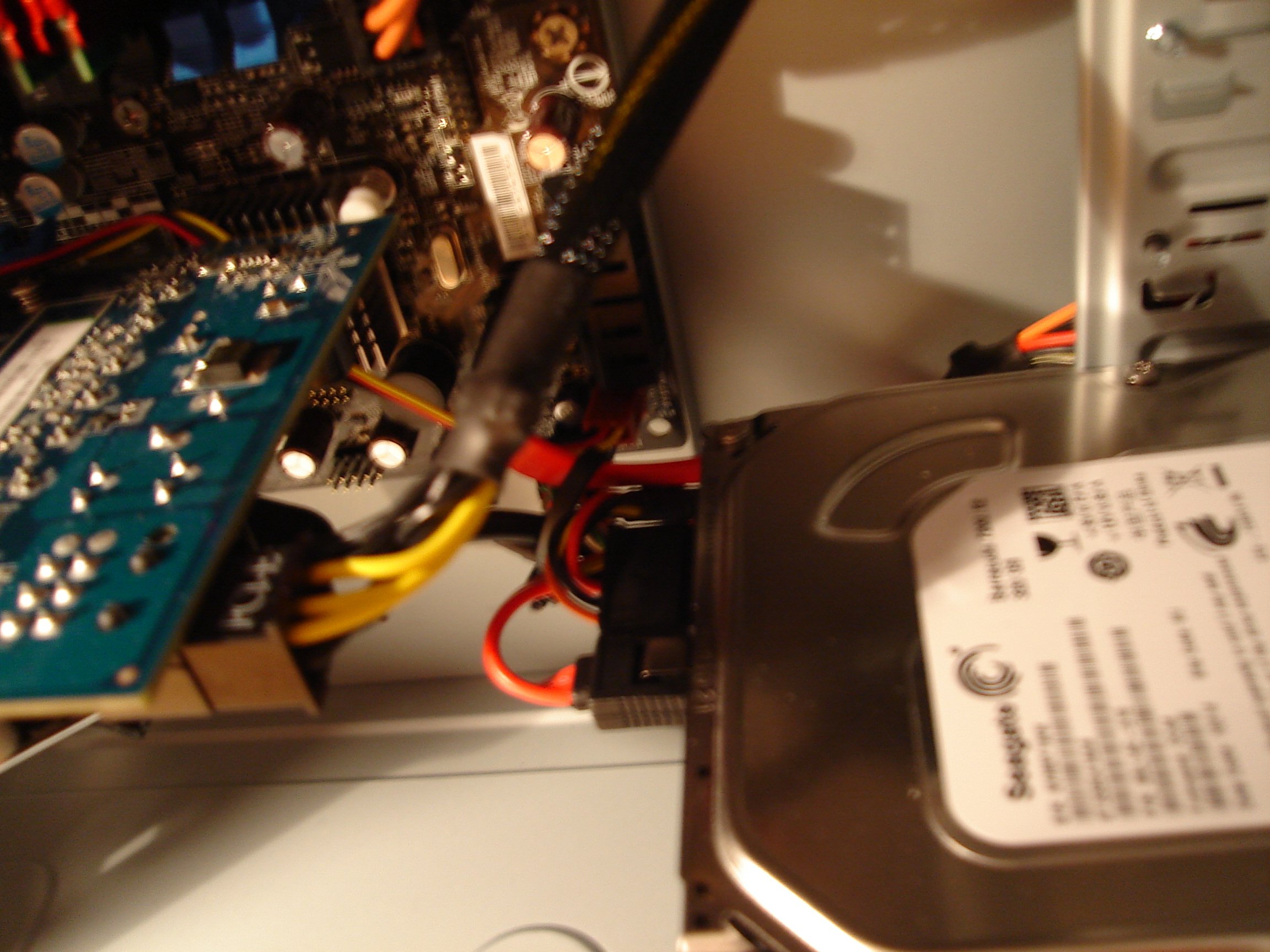 Manifestement... soit il n'est pas alimenté (mais j'ai un doute, car je vois nettement un câble molex qui arrive dessus -on apprécie les photos, bravo!-), soit le disque dur n'est pas branché sur le premier port SATA... soi la carte-mère -ou le BIOS- ne 'reconnait' pas d'origine le SATA.