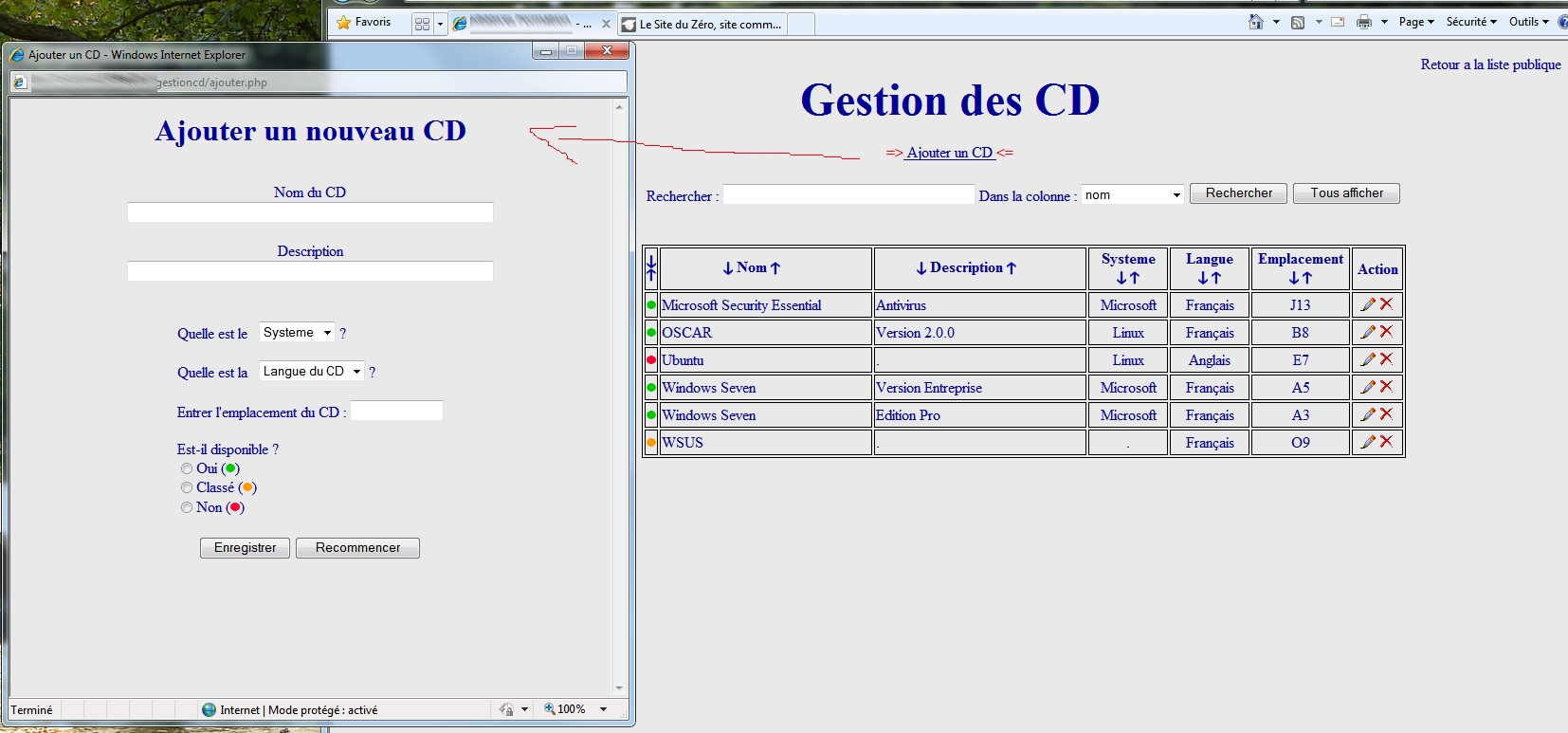 J'ai cree en PHP et HTML des formulaires pour la gestion de CD (voir screenshot) :