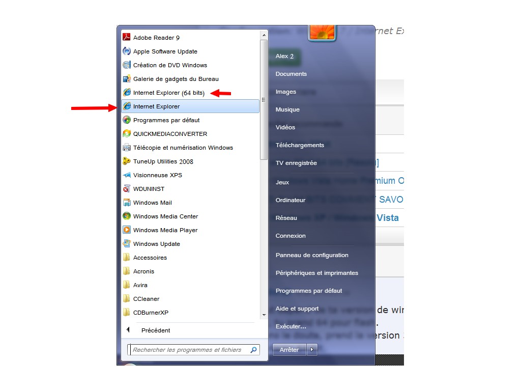 Comme on te l'a dit plus haut (ici) dans Windows 7 64 bits il y a 2 Internet Explorer, un 32 et un 64 bits...