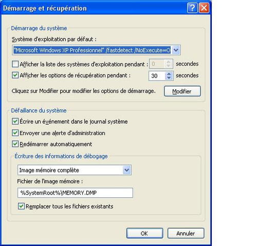 * Clic droit sur "Poste de travail" -> "Propriétés" -> onglet "Avancé" -> choisir "Paramètres" sous la catégorie "Démarrage et récupération"