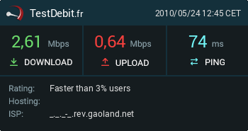 voila, il y a un mois, j'ai prix internet chez moi, le pack tel+tele+internet... il est vendu comme étant du 20Méga, mais au final, je la trouvais lente, et quand je télécharge, ca ne dépasse jamais , ou de très peu les 300K/s ... et quand je fait les test sur https://www.speedtest.net/ ou encore sur https://www.testdebit.fr/