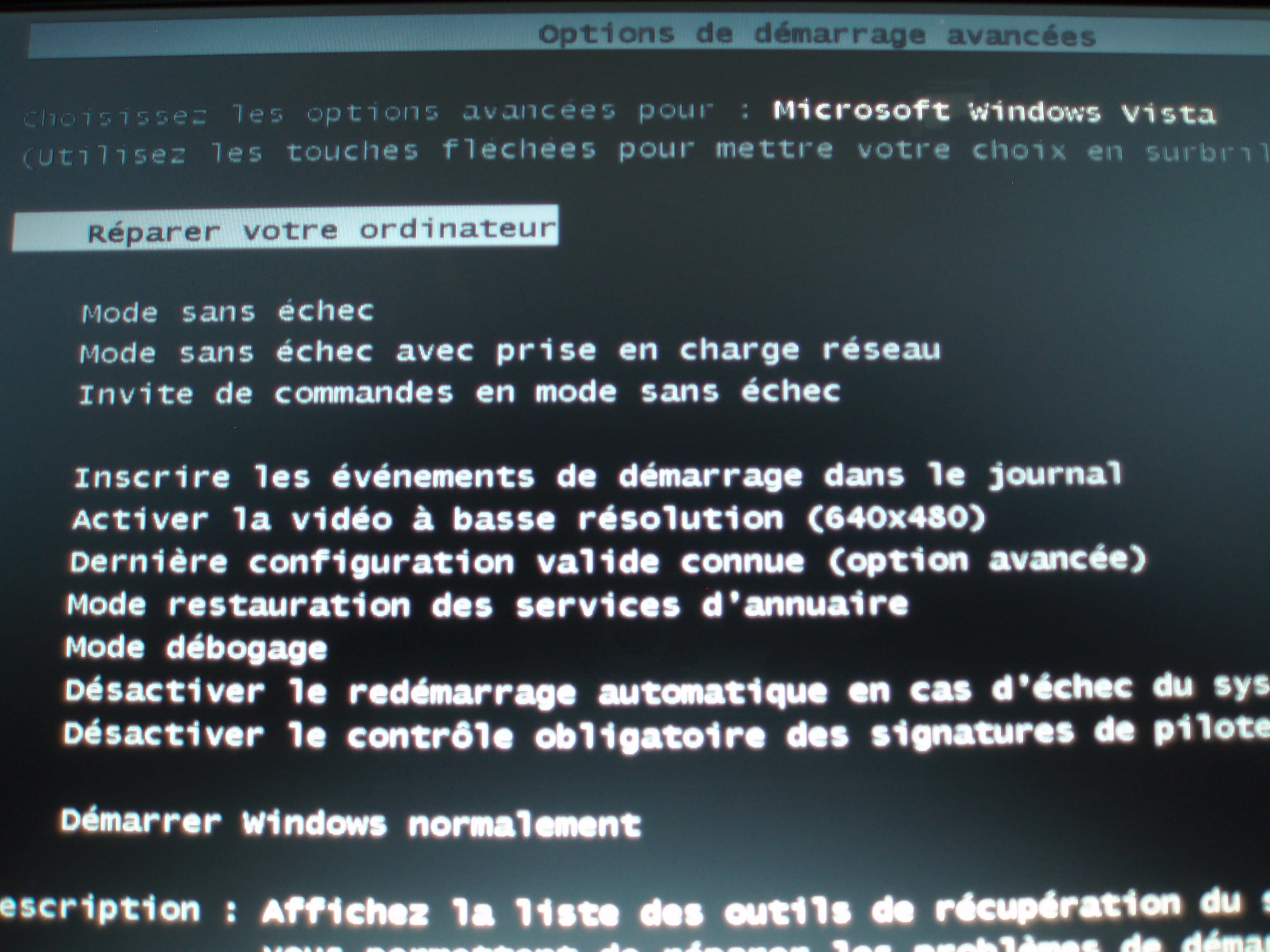 Si je clique sur Lancer l'outils de redémarrage système (recommandé) je reviens à cette page et si je clique sur démarrer Windows normalement un écran noir s'affiche et windows vista ne démarre pas.