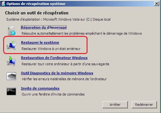 Tente F12 ou F11 ou encore F9 ( imprécision dû aux différents modèles de pc...), et si t'y accède enfin, fenêtre "Installer Windows", clique sur suivant, puis sur la prochaine tu cliqueras sur "réparer" qui se situeras en bas à gauche normalement, puis sur suivant, et encore suivant, ensuite tu devrais avoir une fenêtre qui s'affiche, avec l'option "Restauration système" comme ceci: