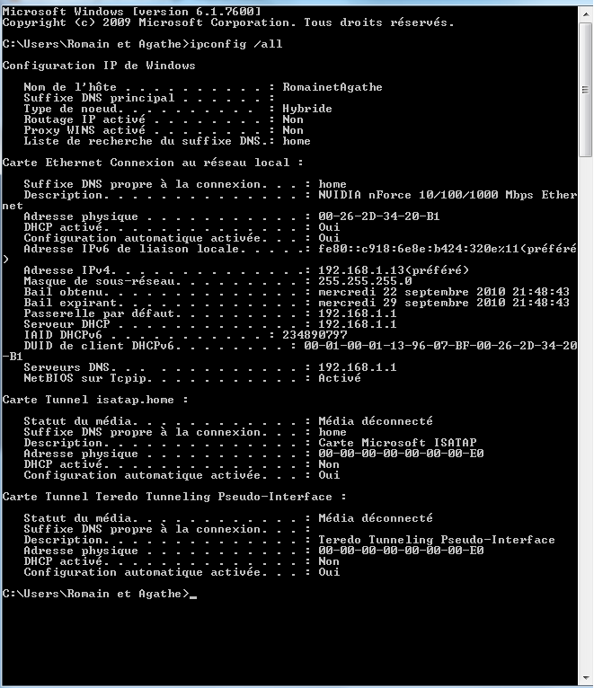 votre ipconfig est correcte, donc aucun problème au niveau de la livebox et de la carte réseau.