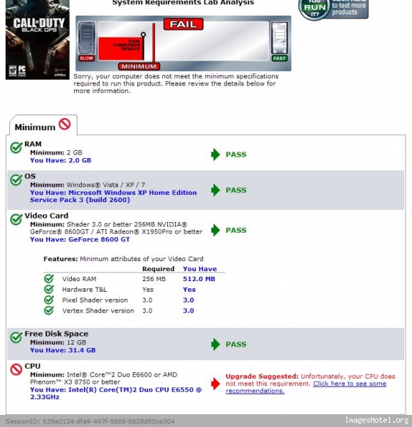 apres avoir vu ton resultat, ta carte semble passer selon le test, j'avais le 8600gts, un peu plus perf que le tien, mais d'un peu,donc, resumons ce que t'as:Intel E6550 @2.33ghz+2goram+nvidia 8600gt, j'trouve que çà peut aller, mais commence par mettre une tres basse résolution et mets tous les reglages details au plus bas aussi, apres tu montes en fonction, pour voir le max qu'il peut supporter, mais ne pousse pas trop car ta config commence à etre à la traine, oublie pas que COD 7 sait mentir pour attirer les acheteurs en mettant compatibilité oui partout, sinon personne n'acheterait, lol