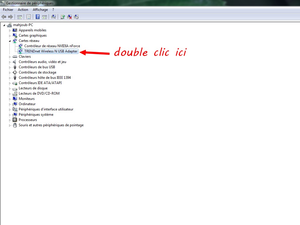 dans le gestionnaire des périphériques, clic sur onglet réseaux, puis double clic sur la carte wifi