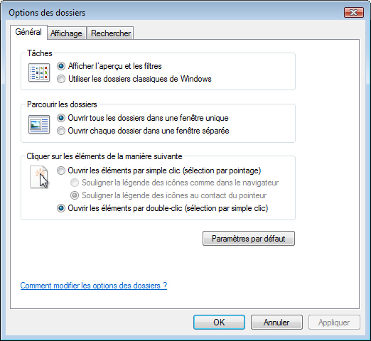 Dans Démarrer/Panneau de configuration sélectionnez Options des dossiers.