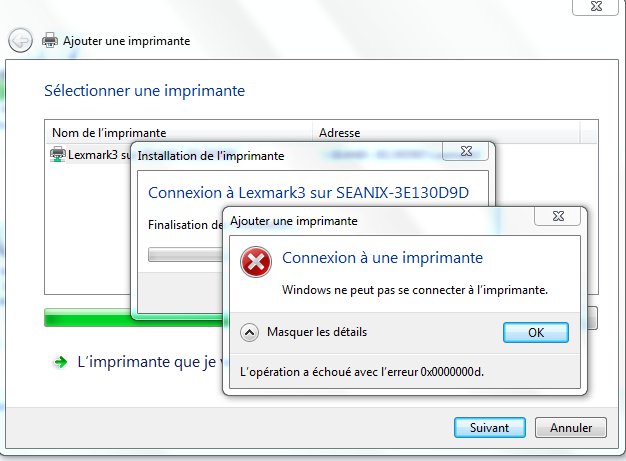 j'ai une imprimante lexmark x3350 (IMP1) connectée a un ordinateur windows XP (PC1). Avec mon ordinateur portable windows 7 (PC2), je n'arrive pas a imprimer sur IMP1. j'ai essayer de suivre ce tutoriel, https://www.commentcamarche.net/faq/2279-imprimantes-partage-d-imprimante , mais il n'a probablement pas été concu pour windows 7 car certain details diffèrent (je ne peut pas choisir "une imprimante réseau connectée à un autre ordinateur", par exemple) et lorsque j'imprime a partir de PC2, tout va bien jusqua ce que cette fenetre apparaisse http://img854.imageshack.us/img854/8091/capturejgv.png jai redemarer les 2 ordinateurs ainsi que l'imprimante elle-meme, et je suis capable d'imprimer avec PC1. sur PC1, IMP1 est cochée partagée. sur PC1, jai un driver pour l'imprimante pour windows XP, sur PC2 jai le meme driver mais pour windows vista x64 (parce qu,il n'existe pas pour windows 7)