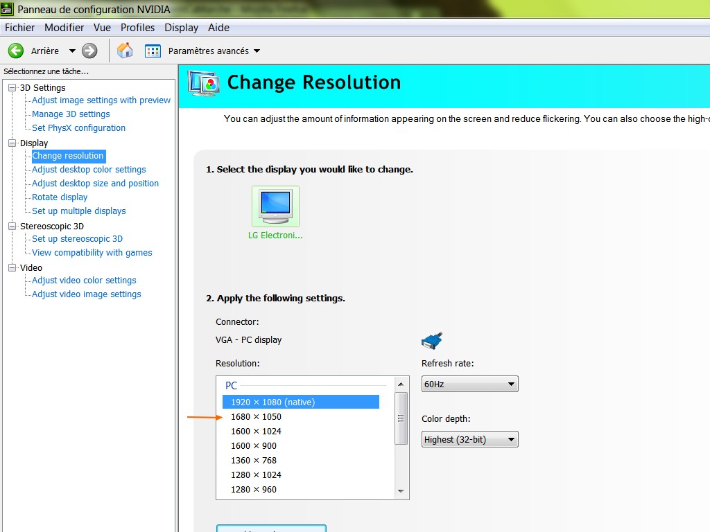 aussi ce que je voudrai faire c'est mettre la resolution en 1680*1050 mais je ne la trouve pas ne trouve 1280*720 et je passe directe a 1920*1080.