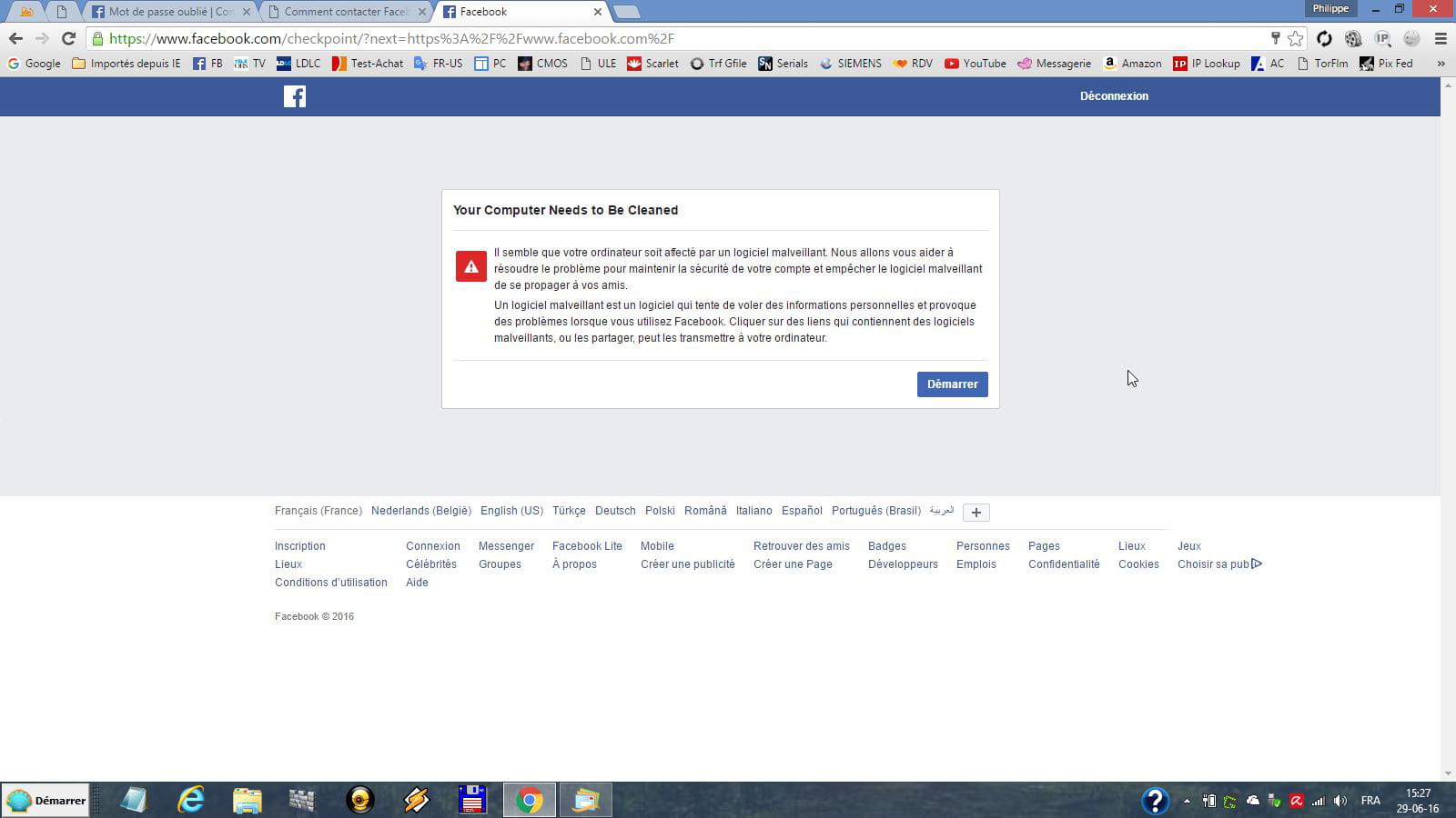 je suis une "pas douée" de l info, je n arrive plus à aller sur ma page FB depuis hier, à chaque fois que je rentre mon adresse et mot de passe , j ai droit au message suivant : securisez votre compte, puis s ouvre une page avec un logiciel macaffe à télécharger... et... ça ne marche pas!!! A coté de ça j ai un autre ordi où là je peux me connecter sans pb!!! j y comprends rien!!! Y a til quelqu un qui peut m aider!!!MERCI!!