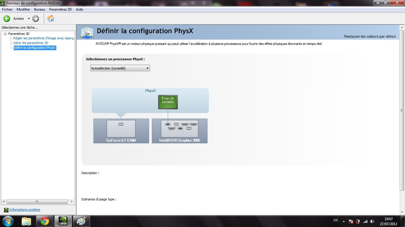 Oui, moi aussi j'ai le même problème avec ces mêmes composants graphiques, j'ai l'impression que la NVIDIA GeFroce GT630m n'est pas activer et que c'est la INTEL HD 3000 qui fonctionne.