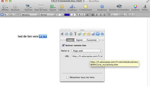 Dans Pages, j'écris une phrase, et dans le mot jeu, j'insère le lien qui va ouvrir la page