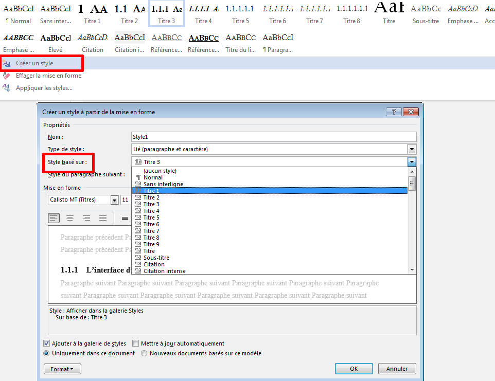 Pour ce faire, lorsque tu te rends dans "créer un style" dans la partie des titres de l'onglet "accueil", clique sur "Modifier..." dans la fenêtre qui s'ouvre, tu sélectionnes ensuite en face de "Style basé sur:" dans la liste déroulante, le niveau de titre correspondant à la hiérarchie souhaitée, par exemple Titre 1 pour le titre du document ou Titre 2 pour un grand chapitre.