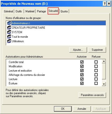 Après avoir fait un clic droit sur ton logiciel ou le raccourci sur le bureau, tu te trouves en principe dans l'onglet 'général'. l'onglet sécurité est en général à droite de celui ci. Regardes sur cette image : http://static.commentcamarche.net/www.commentcamarche.net/faq/images/0-25KyLVkS-autor3-s-.png