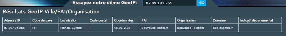 Essayez par exemple avec votre propre IP obtiendrez de manière immédiate grace à ce site: