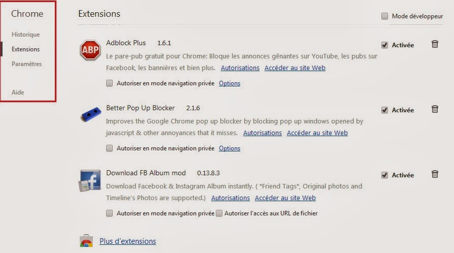 6-Vous pouvez trouvez en haut a gauche, plus de paramètres, par exemple Les extensions installées sur votre Nav.Chrome. Vous aurez la possibilité de les activer ou de les désactiver.