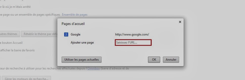 3-Ajoutez n'importe quel lien dans la zone en rouge d'une page que vous voulez qu'elle s'ouvre au démarrage de votre navigateur web.Puis validez par le bouton OK.