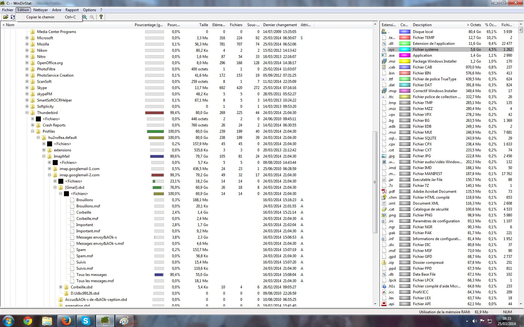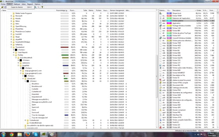 Dans WinDirStat, pour savoir où sont les fichiers concernés, en haut à droite, sélectionne la ligne que tu veux voir, dans le graphisme du bas en couleur, tous les fichiers du même format vont être entourés de blanc, promène ta souris dessus, et tu verras le chemin d'afficher tout en bas. Clic sur un de ces fichiers et l'emplacement va s'ouvrir en dessus dans les dossiers.