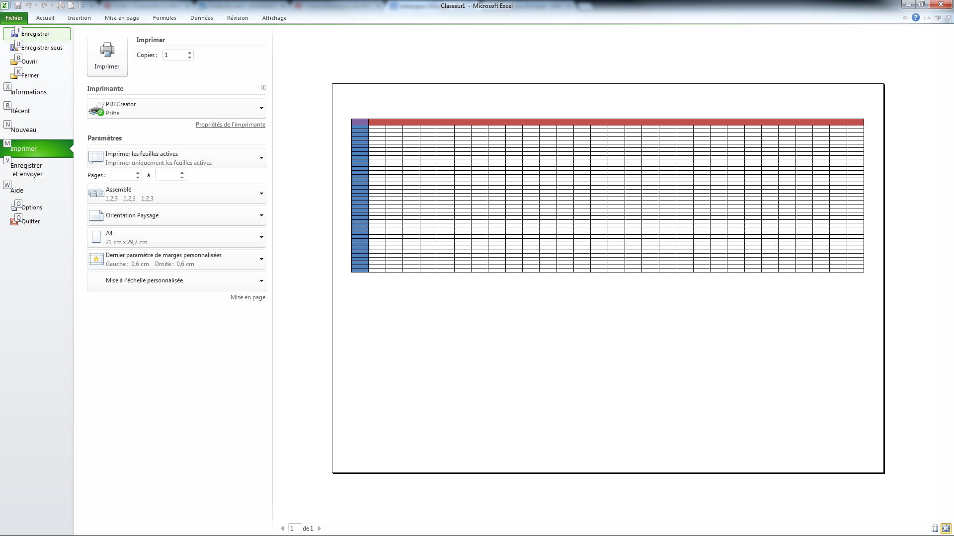 Je suis sous excel 2010 et je souhaite imprimer un tableau excel en paysage sur l'ensemble d'une page A4.