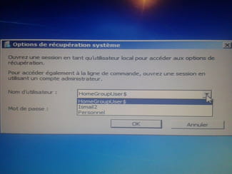 Puis le problème intervient, une boite de dialogue apparait avec un nom d'utilisateur (j'ai le choix entre Personnel et HomeGroupUser$) et un mot de passe Je connais le mot de passe de Personnel et quand je le rentre il est valide mais ensuite j'ai plusieurs options, mais il n'y pas Réinitialiser l'ordinateur. Donc je pense qu'il se trouve dans HomeGroupUser$.