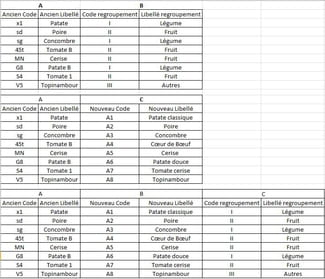 C : Une nouvelle liste de noms plus précise ou exacte (Ex : patate Roseval, cerise, raisin Muscat, Patate Vitelotte, Raisin chasselas...) et des nouveaux codes de références