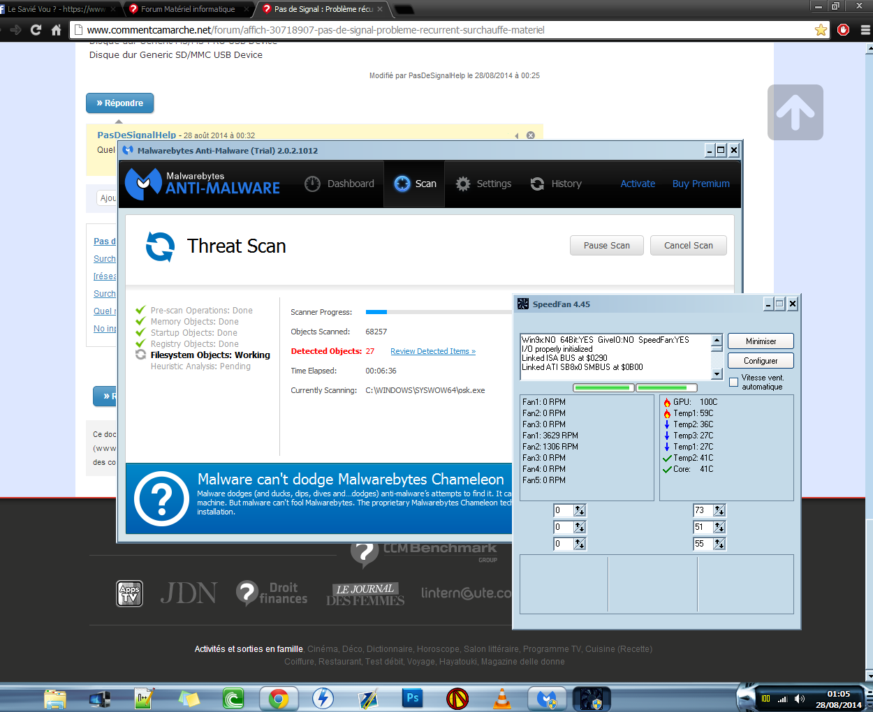 Après le scan Malware Bytes il y a eu 405 " problèmes ", esperons que le problème pas de signal peux provenir de ça.