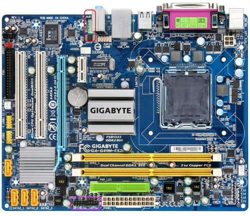 Entouré de fuchsia (en bas), les pines sur base noire pour l'allumage, le reset, la LED du DD et la LED d'allumage.
