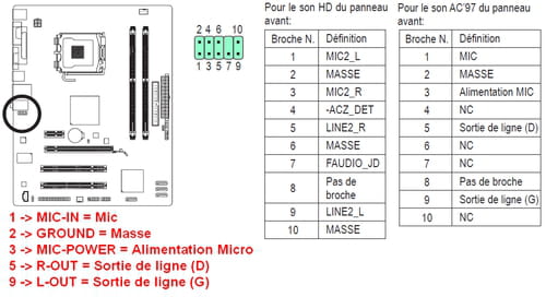 Entouré de rouge (en haut), les pines sur base vert clair pour l'audio et micro.