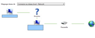 Sur l'image ci-dessus, on peut voir mon mappage réseau. J'aurais souhaité savoir si le point d'interrogation signifie que mon ordinateur (à droite) est relié à un autre ordinateur (au milieu) avant de se connecter à internet?