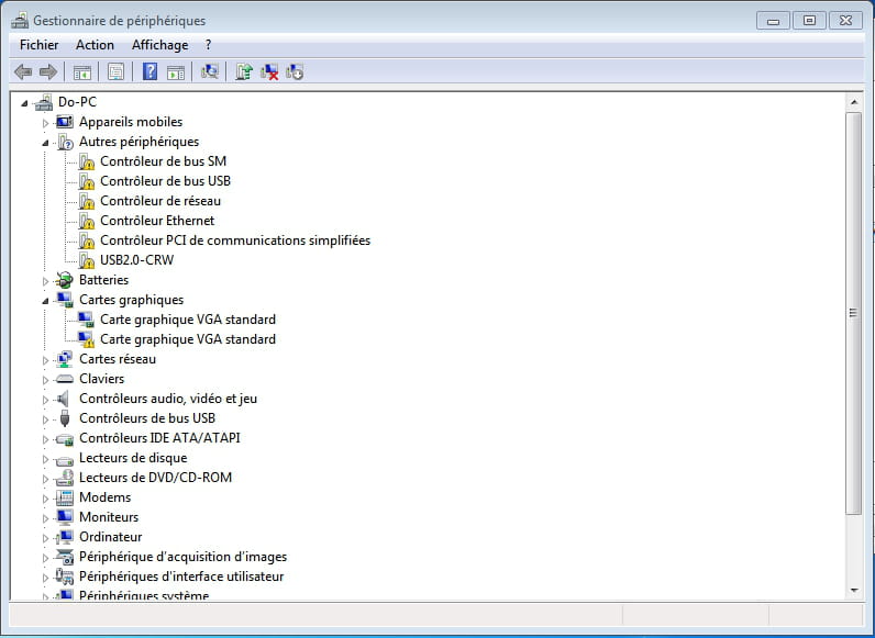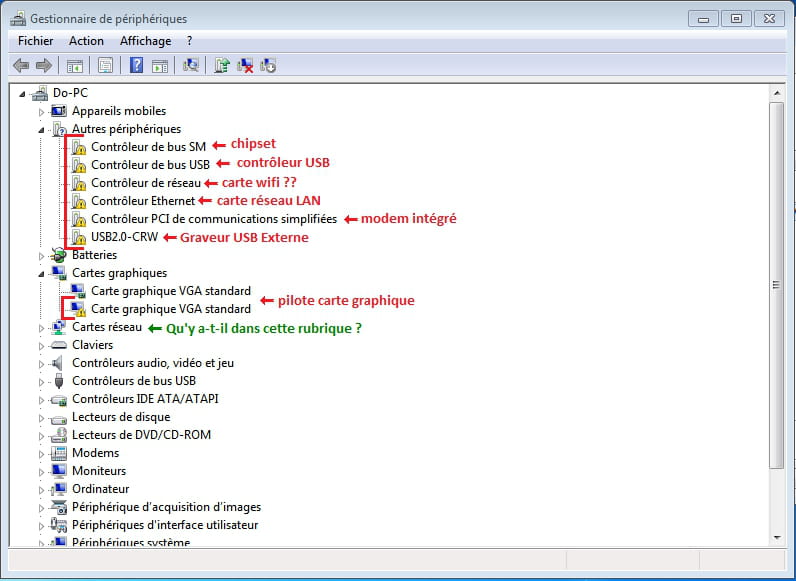 pour être bien sûr , les périphériques en défauts ou inconnus sont ceux avec le petit triangle à côté c'est bien ça ?