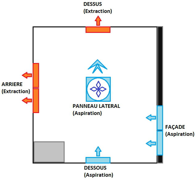 En général, le minimum c'est l'alimentation en position basse, 1 ventilateur en aspiration et 1 en extraction. Ils sont aussi généralement prévus pour des ventirads importants.