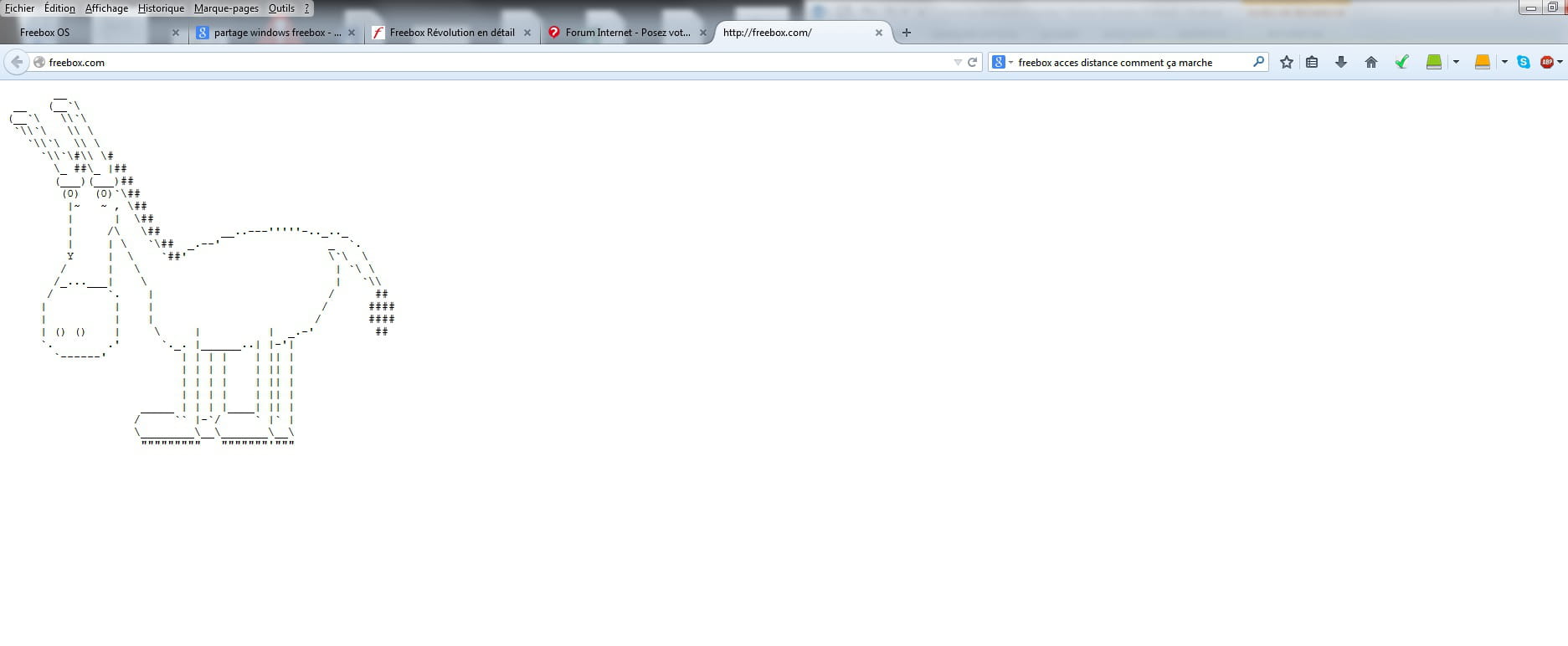 Puis un jour, ça n'as plus marché. soupçonnant une mise à jour, j'ai cherché une autre solution, j'ai trouvé le site http://mafreebox.freebox.fr/ et ça a marché. Aujourd'hui, ce site à planté plusieurs fois, et j'ai cherché une solution. Je me suis rendu compte que "normalement" écrire \\Freebox était toujours sencé marché. Et j'ai trouvé "pire", c'est à dire que lorsque je rentre "freebox.com" sur mozilla, je tombe sur une page tout blanche avec cela :