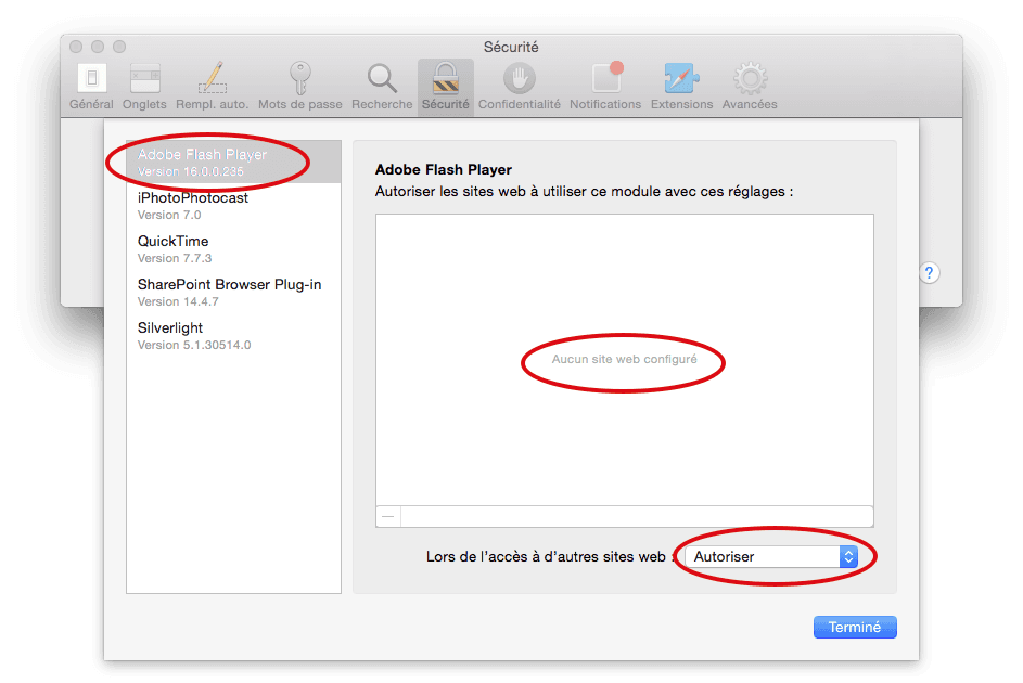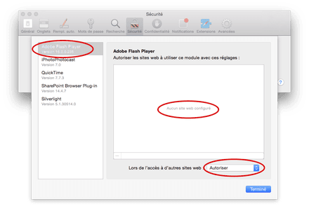 comment ajuster les préférences de sécurité de safari afin que le contenu flash de ce domaine fonctionne correctement
