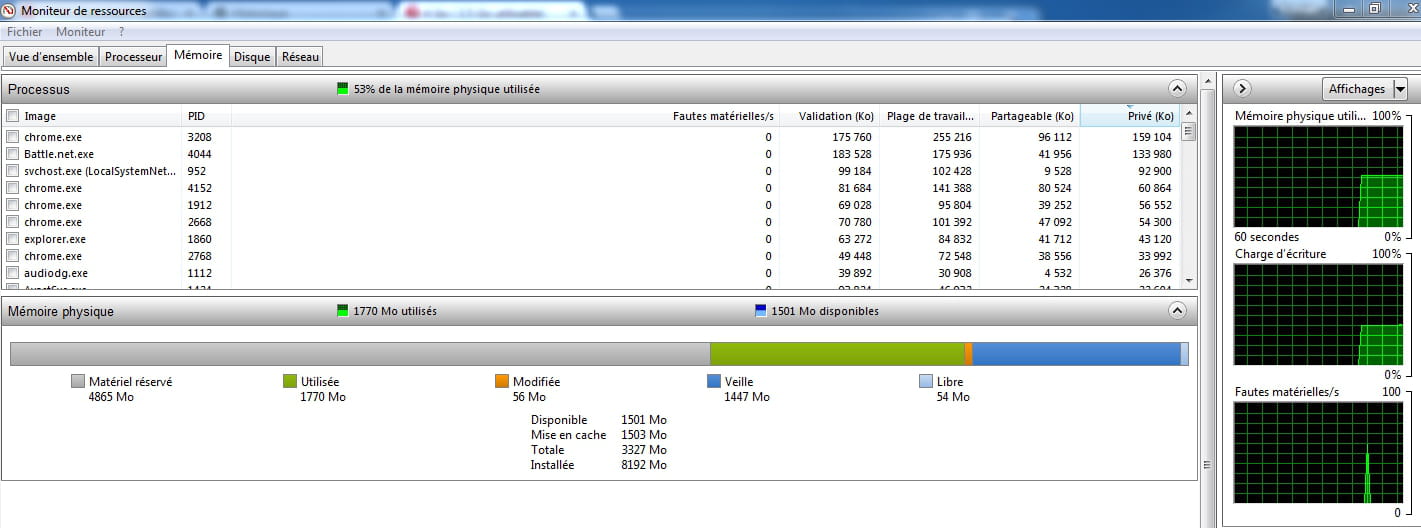 J'ai utilisé le Moniteur de Ressources (Panneau de configuration > Outils d'administration > Analyseur de performances > Ouvrir le Moniteur de ressources) et: