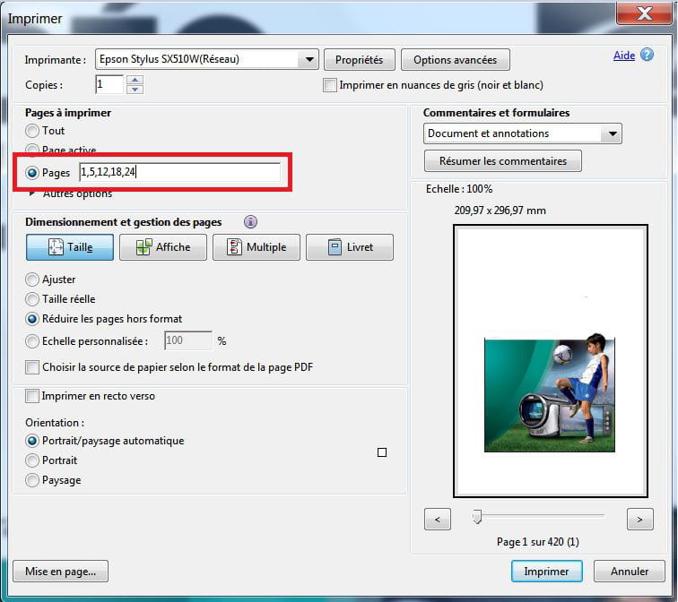 Par exemple, pour une Epson, il suffit de sélectionner Pages à imprimer, pages, puis de les chiffrer en séparant chacune d'elles par une virgule, comme dans l'image ci-dessous.