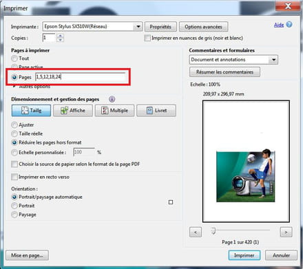 Par exemple, pour une Epson, il suffit de sélectionner Pages à imprimer, pages, puis de les chiffrer en séparant chacune d'elles par une virgule, comme dans l'image ci-dessous.