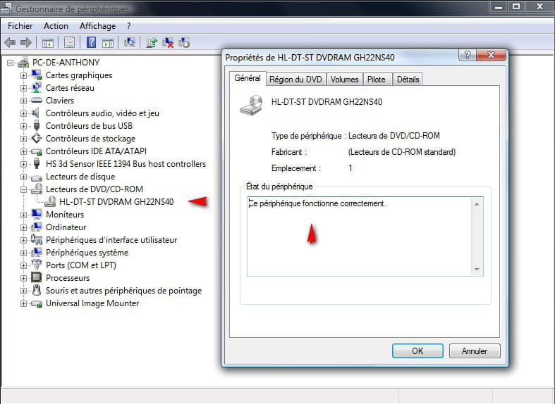 j'ai retrouver le lecteur dans ma liste gestionnaire de périphérique mais sous l'intitulé périphérique caché et le symbole du lecteur dans la ramification est grisé ,quand a mon lecteur il a l'aire d'être alimenté et maintenant ils'ouvre et se referme tous de suite sans laisser le temps de mètre un cd