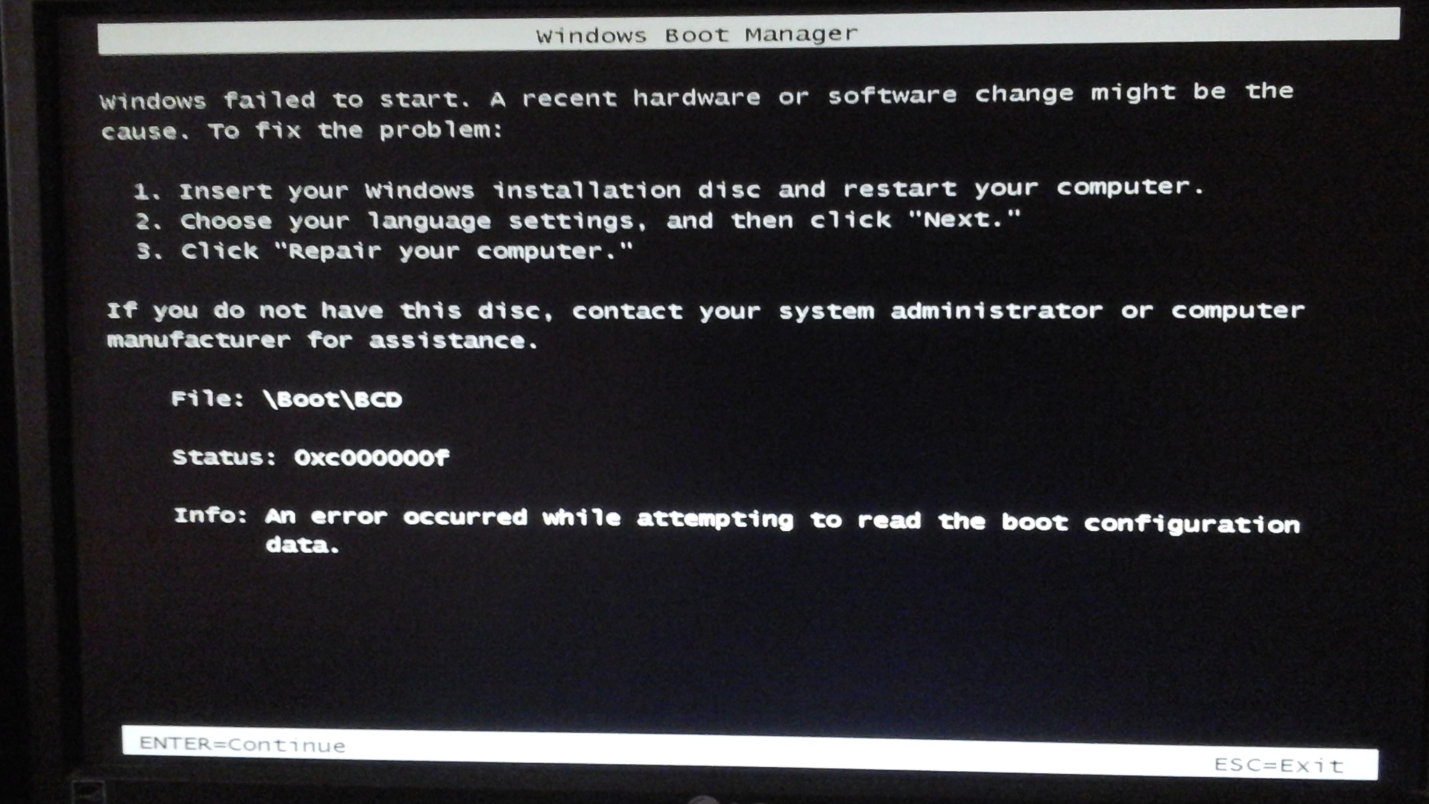 Quand je bootais sur mon ancien disque, tout allait bien : je pouvais lancer la version Windows 7 depuis le SSD et depuis le disque dur. Le problème, c'est que je ne pouvais pas booter sur le ssd, j'avais le message :