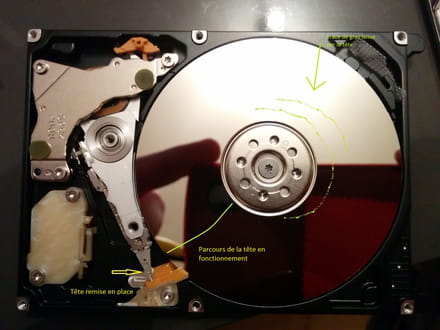 Mais fait très vite, le fait que tu ai remis en place la tête de lecture est une erreur non négligable car l'espace entre la tête et le plateau et à moins de 10 nanomètres de distance, soit une épaisseur 10000 fois plus petite qu'un cheveu !!