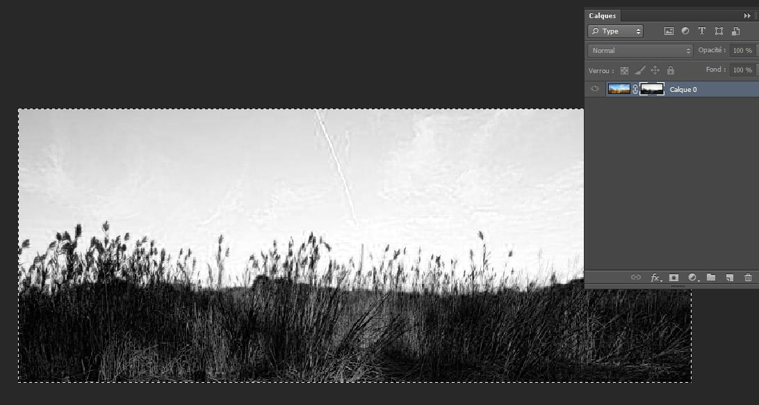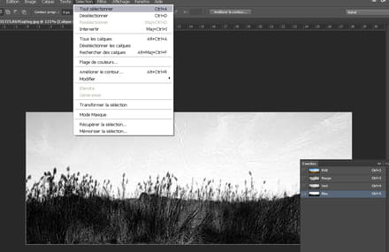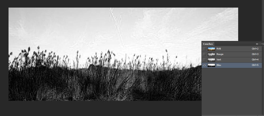 - calque image actif: panneau couches -> sélectionner la couche offrant le meilleur contraste (la bleue pour l'exemple)