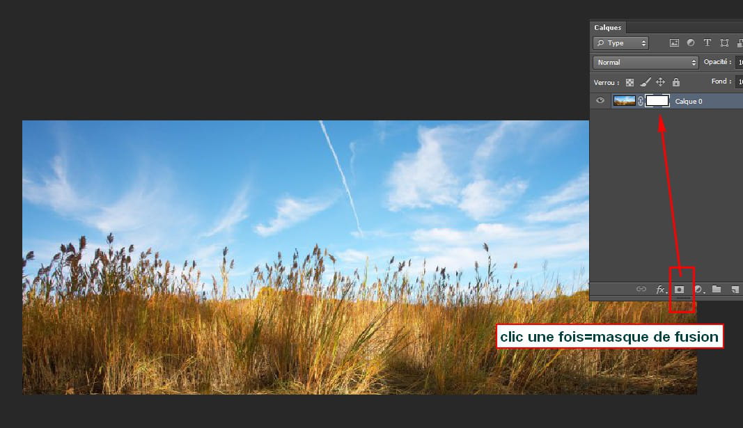 - panneau calques: clic une fois sur l'icône masque pour créer un masque de fusion ( et non un masque vectoriel qui nécessite 2 clics)